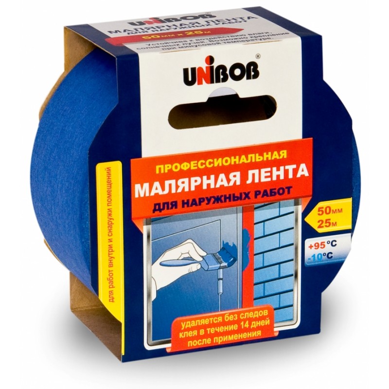 Клейкая лента малярная для наружных работ 25мм*25м UNIBOB (синяя) инд. упаковка 46571