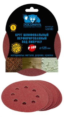 Круг 125 мм зерно 180 шлифовальный, перфорированный 8 отверстий под липучку (5 шт./уп.) "РОСОМАХА"
