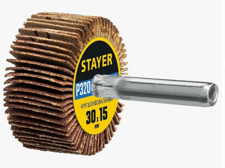 30 мм. STAYER d 30 x 15 мм, P320, на шпильке d 6 мм, круг шлифовальный лепестковый (36606-320)
