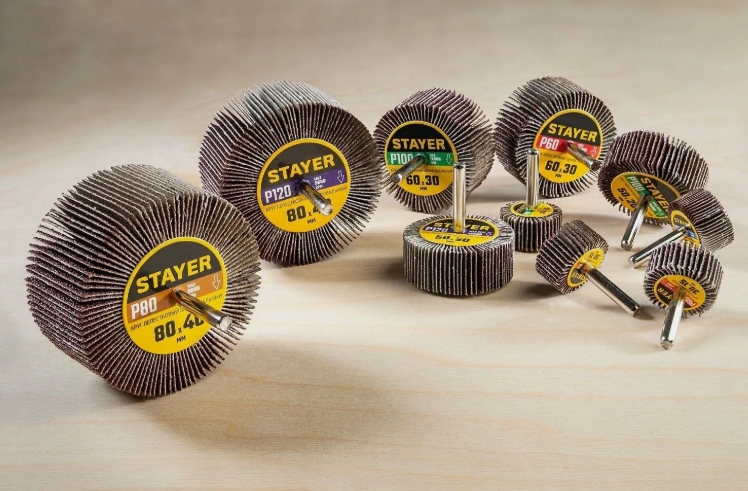 60 мм. STAYER d 60 x 30 мм, P120, на шпильке d 6 мм, круг шлифовальный лепестковый (36608-120)