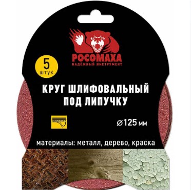 Р180. Круг 125 мм зерно 180 шлифовальный под липучку (5 шт./уп.) "РОСОМАХА"