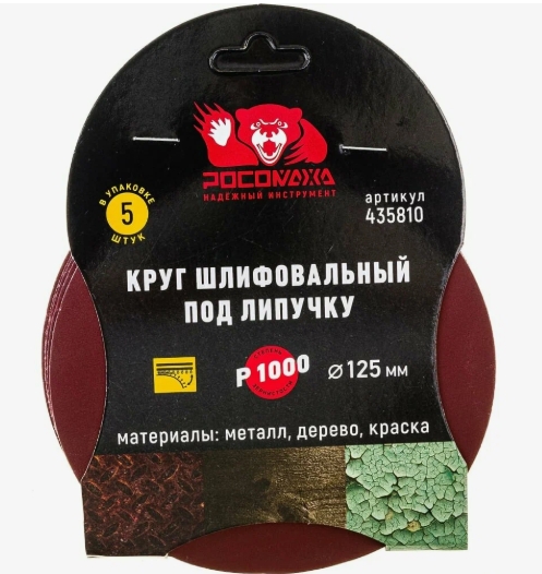 Р1000. Круг 125 мм зерно 1000 шлифовальный под липучку (5 шт./уп.) "РОСОМАХА"