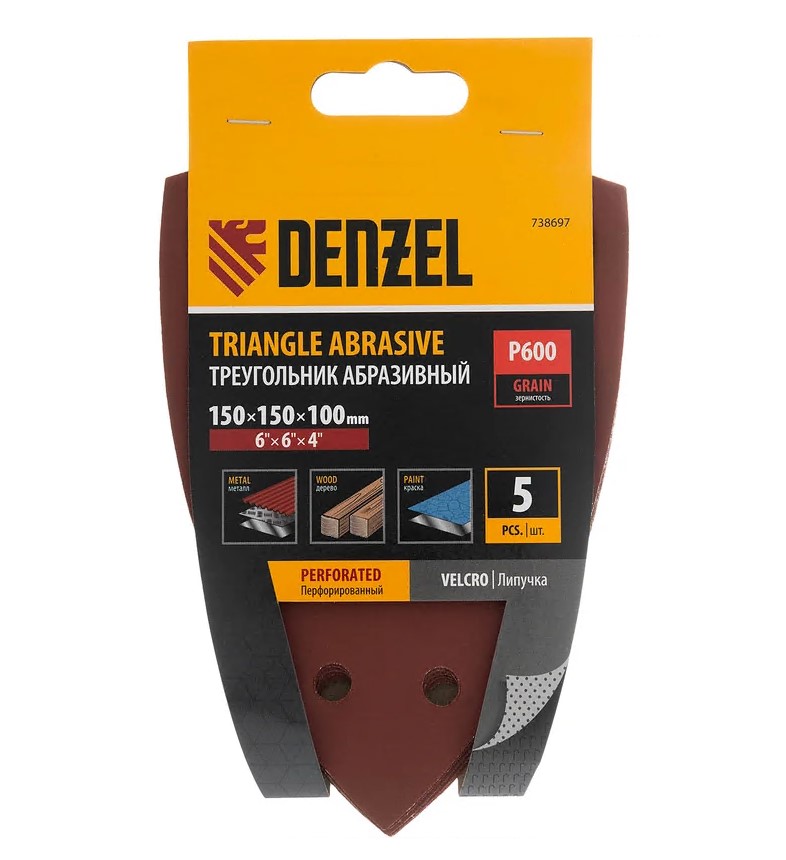 Р600. Треугольник абразивный на ворc. подложке под "липучку", перф., P 600, 150х150х100 мм, 5 шт.// Denzel