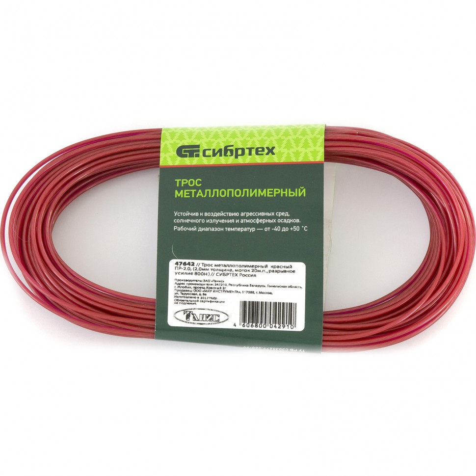 Трос металлополимерный красный ПР-2.0, (2,0мм толщина, моток 20м.п.), Россия// Сибртех