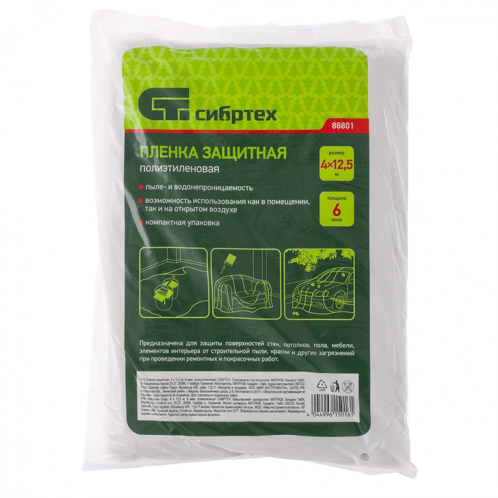 Пленка защитная, 4 х 12,5 м, 6 мкм, полиэтиленовая// Сибртех